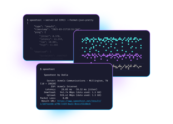 O Speedtest CLI traz a tecnologia confiável e a rede global de servidores do Speedtest para a linha de comando.